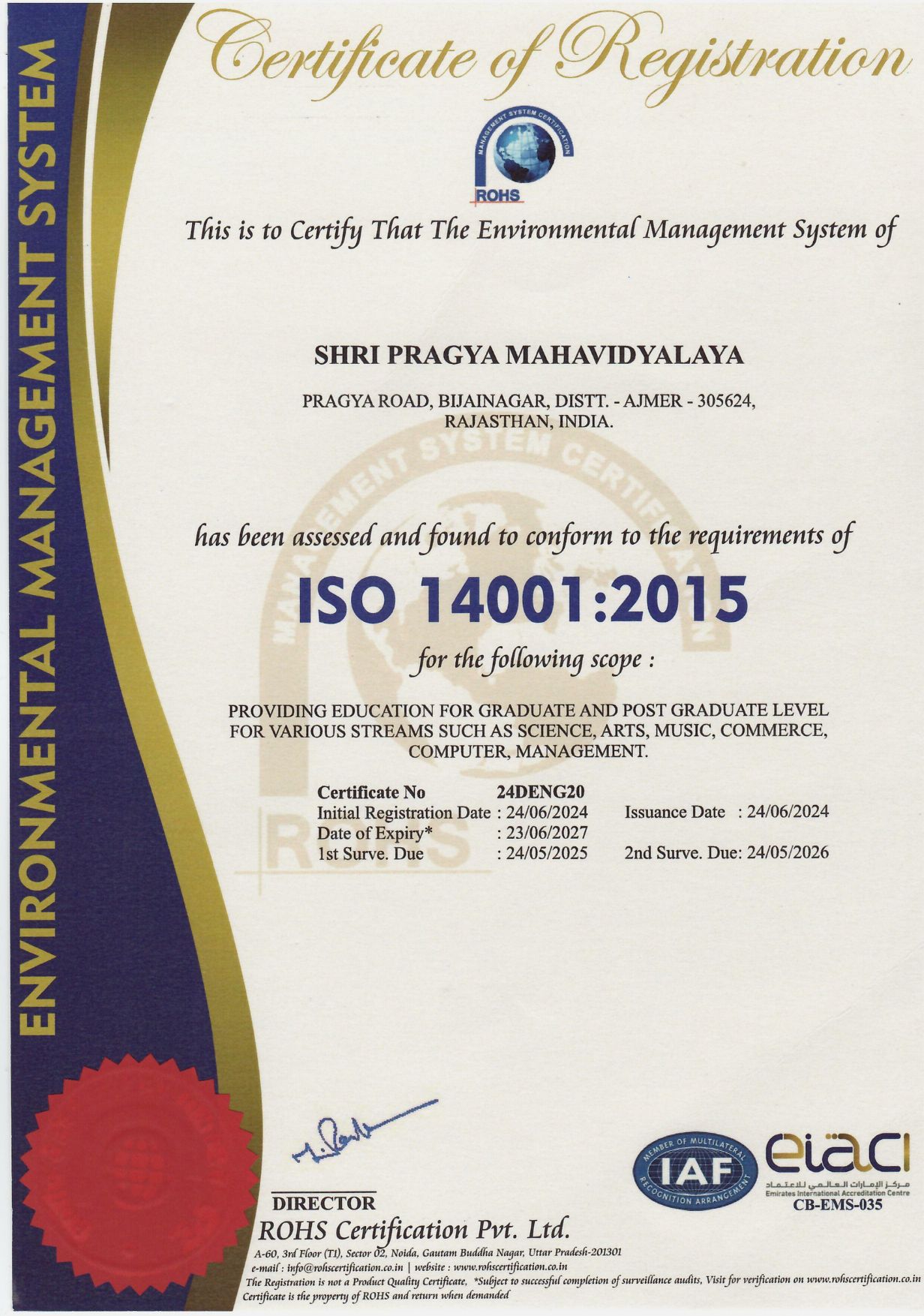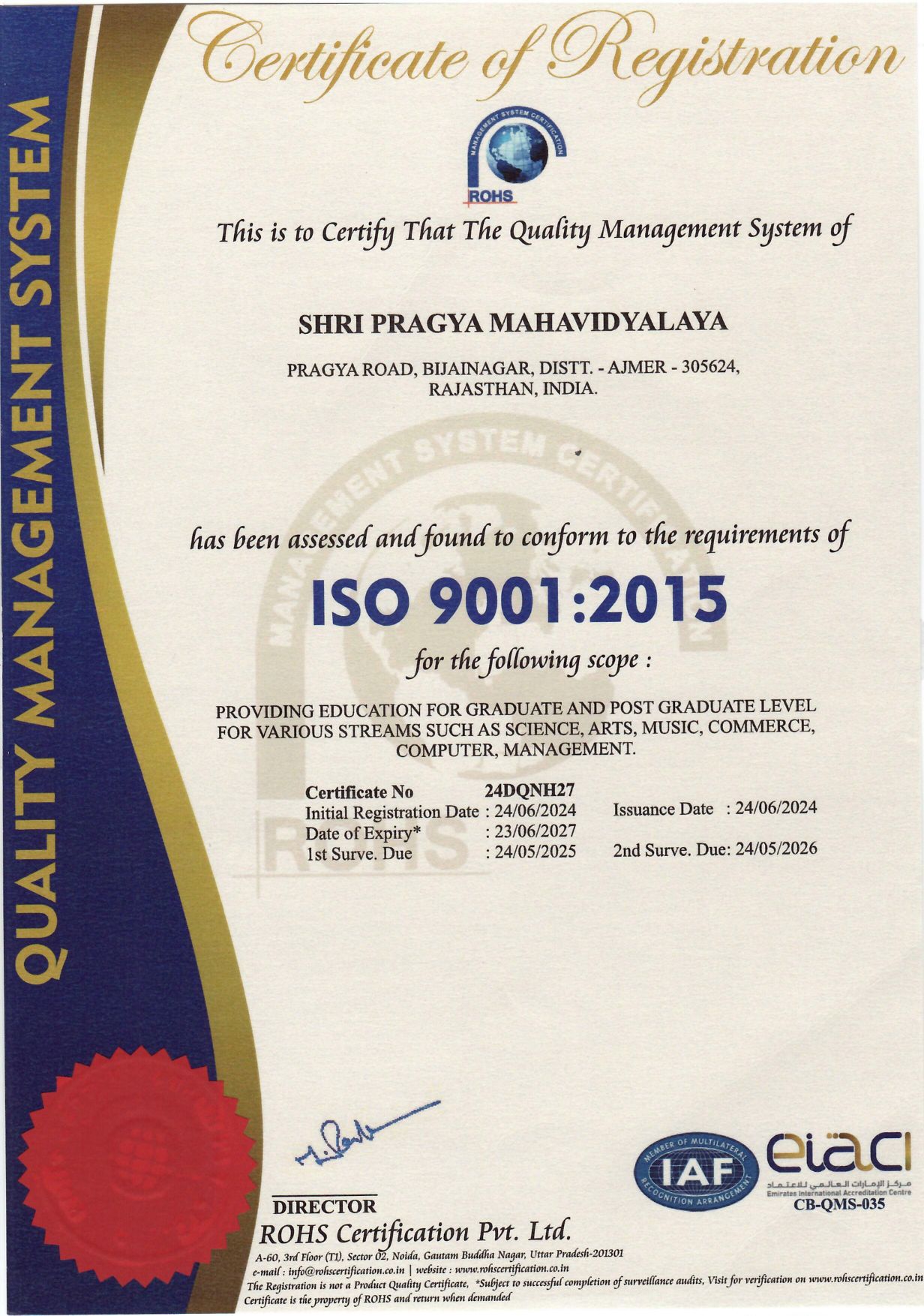 • ISO 9001:2015 Certification, awarded to Shri Pragya Mahavidyalaya for its robust Quality Management System in delivering graduate and postgraduate education across multiple streams including Science, Arts, Music, Commerce, Computer, and Management.
